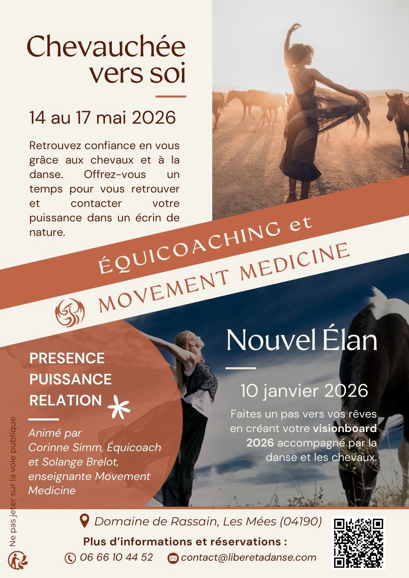 Ce stage ressourçant, intitulé Chevauchée vers soi, propose une immersion de trois jours mêlant Movement Medicine (danse libre consciente) et Équicoaching, une approche puissante qui s’appuie sur la relation avec le cheval pour éclairer nos fonctionnements et retrouver notre axe intérieur.