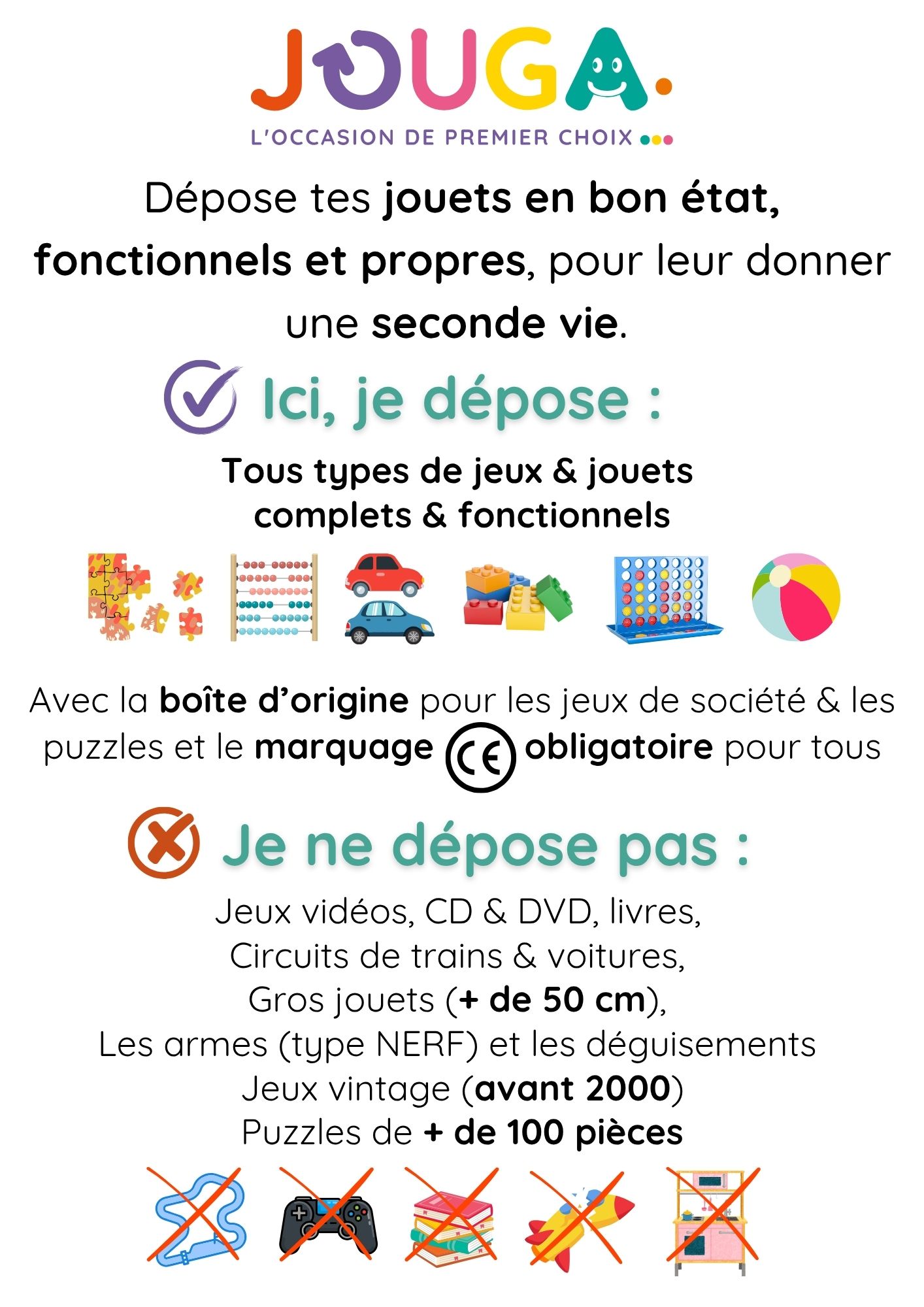 Dans le cadre de cette action solidaire, nous nous associons à l’entreprise JOUGA, spécialisée dans le rachat et la revente de jouets d’occasion. L’objectif est de donner une seconde vie aux jeux et jouets qui ne sont plus utilisés. Attention, une charte qualité est exigée (voir ci-contre)